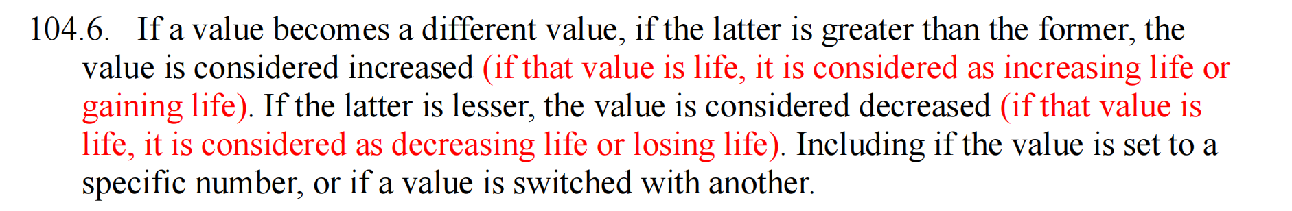 如果1个数值将要变成1个新的数值,如果新的数值大于旧的数值,则该数值被视为增加。(如果该数值为生命值,则被视为增加生命或获得生命。)如果如果新的数值小于旧的数值,则该数值被视为减少。(如果该数值为生命值,则被视为减少生命或失去生命。)此变化包括该数值变成1个指定的数值,或该数值被交换成另外一个。