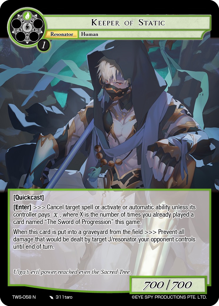 当此牌从战场放进坟场时 >>> 防止目标由你对手操控的裁决者/生物将要造成的所有伤害直到回合结束。
