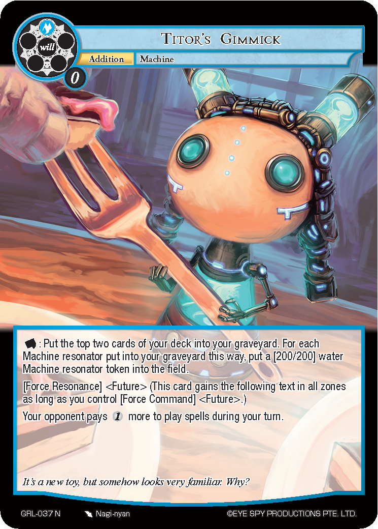 :将你牌库顶的2张牌放进你的坟场。每以此法将1个机械生物放进坟场,将1个[200/200],水属性机械生物衍生物放进战场。