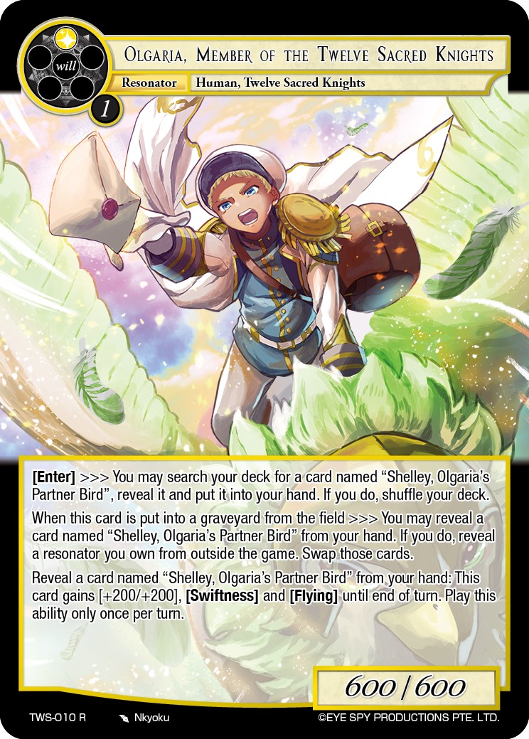[参战] >>> 你可以从你的牌库中搜寻1张名为“奥尔加莉亚的鸟伙伴 谢莉”的牌,将其展示并加入你的手牌。若如此做,将你的牌库洗牌。