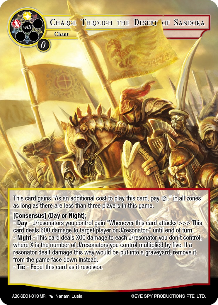 - 日 - 由你操控的裁决者/生物获得“每当此牌攻击时 >>> 此牌对目标玩家或裁决者/生物造成600点伤害。”直到回合结束。